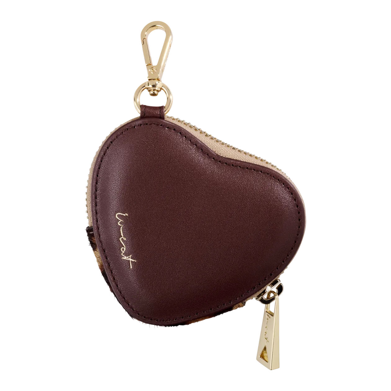 Ein stilvolles Accessoire für jeden Tag: Die Mini-Geldbörse für Münzen oder Karten eignet sich auch wunderbar als Anhänger für die Handtasche. Die Herzform mit Leopardenmuster und vergoldete Details machen das kleine Designerstück zum Hingucker.