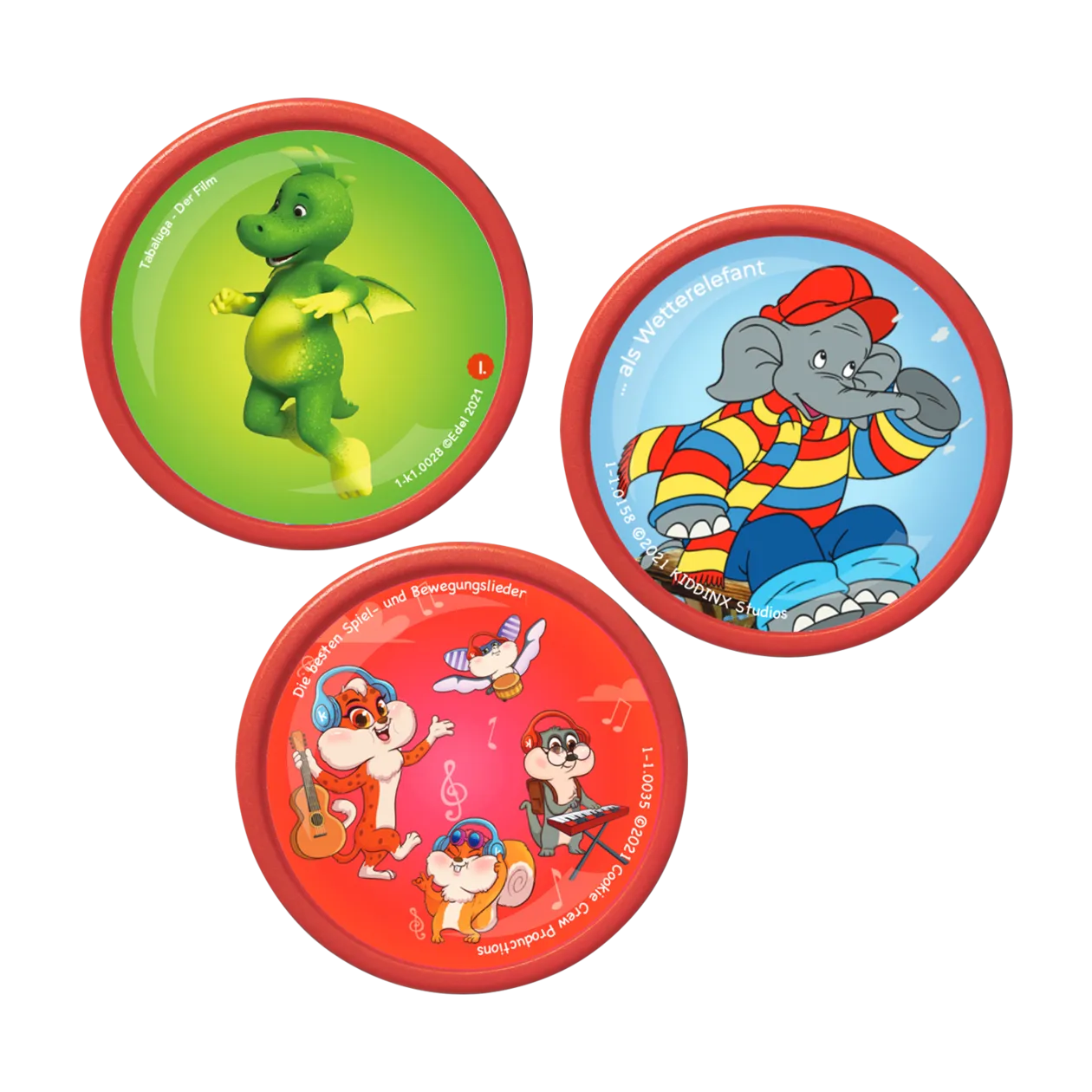 - The set includes: audio chip "Benjamin Blümchen, Folge 1", audio chip "Cookie Crew, 32 Spiel- & Bewegungslieder", audio chip "Tabaluga"